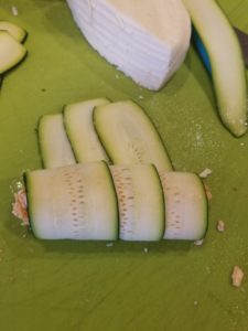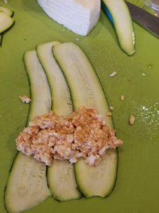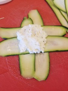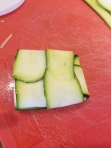 Then you will need 4 strips of the zucchini. Lay 2 out vertically and 2 out horizontally, and place your filling in the middle. Fold both ends in to make a ravioli shape.