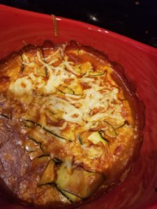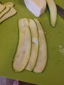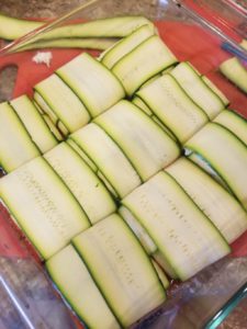 This starts the same as the enchiladas! You’ll need the long, thin strips of zucchini made by cutting it in half the long way and using the T peeler to make thin strips. This time you will fill it Italian style! I make my filling out of ricotta, cottage, and shredded Parmesan cheeses mixed together. I had some Italian spices, garlic salt, and onion powder. I usually just eyeball this!
